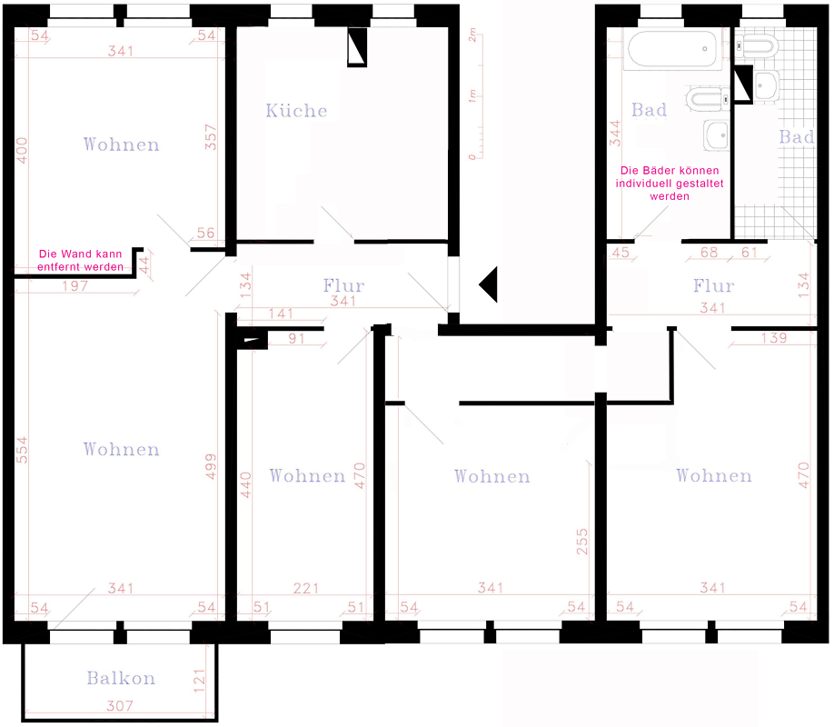 Wohnraumzusammenlegung 5-Raum WE mit großer Küche und 2x Bad mit Fenster